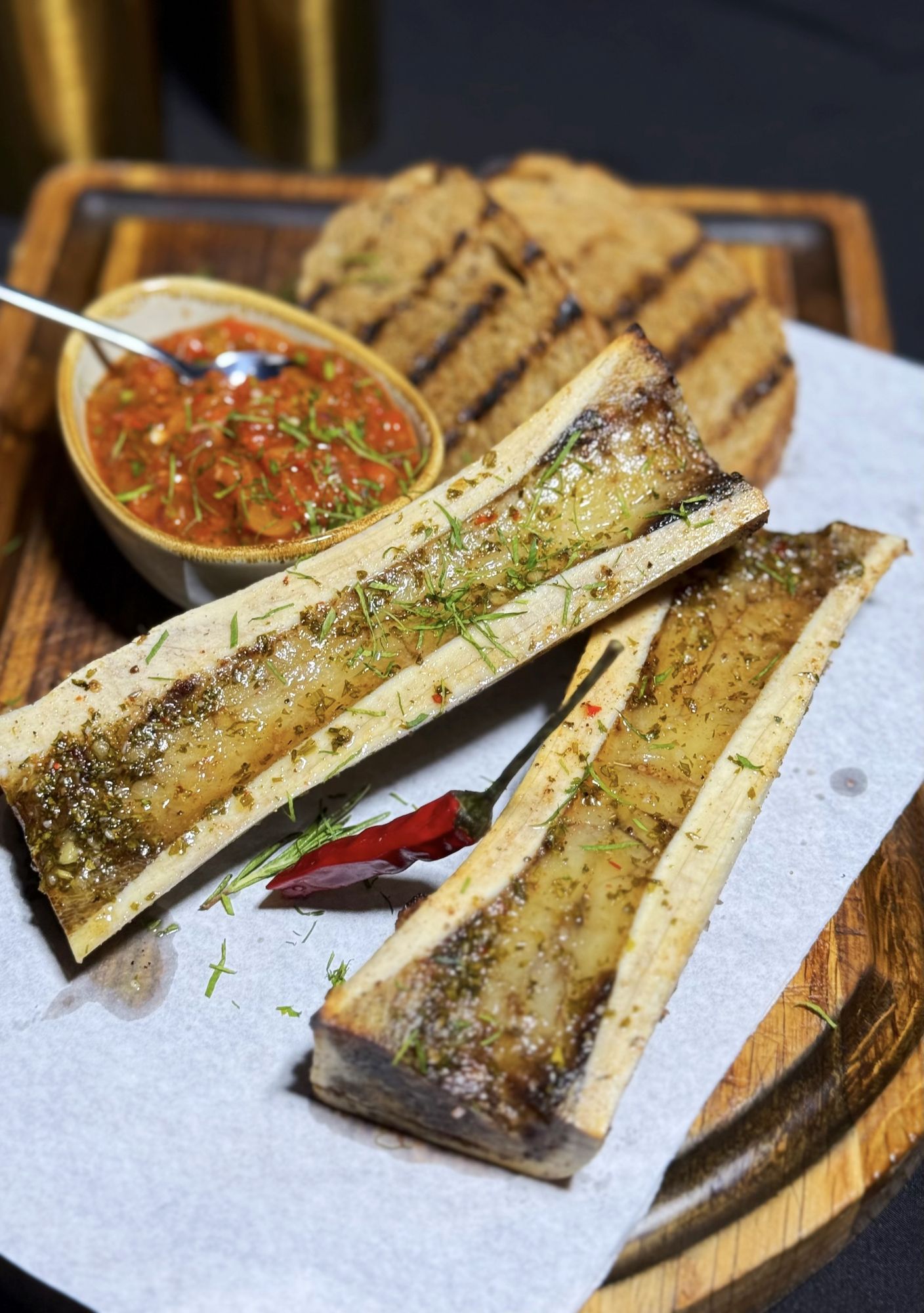 деликатес из крупной говяжьей кости, содержащий питательный костный мозг, запеченный со специями, подается с хрустящими гренками, пикантным соусом сальса, из ароматных печеных овощей