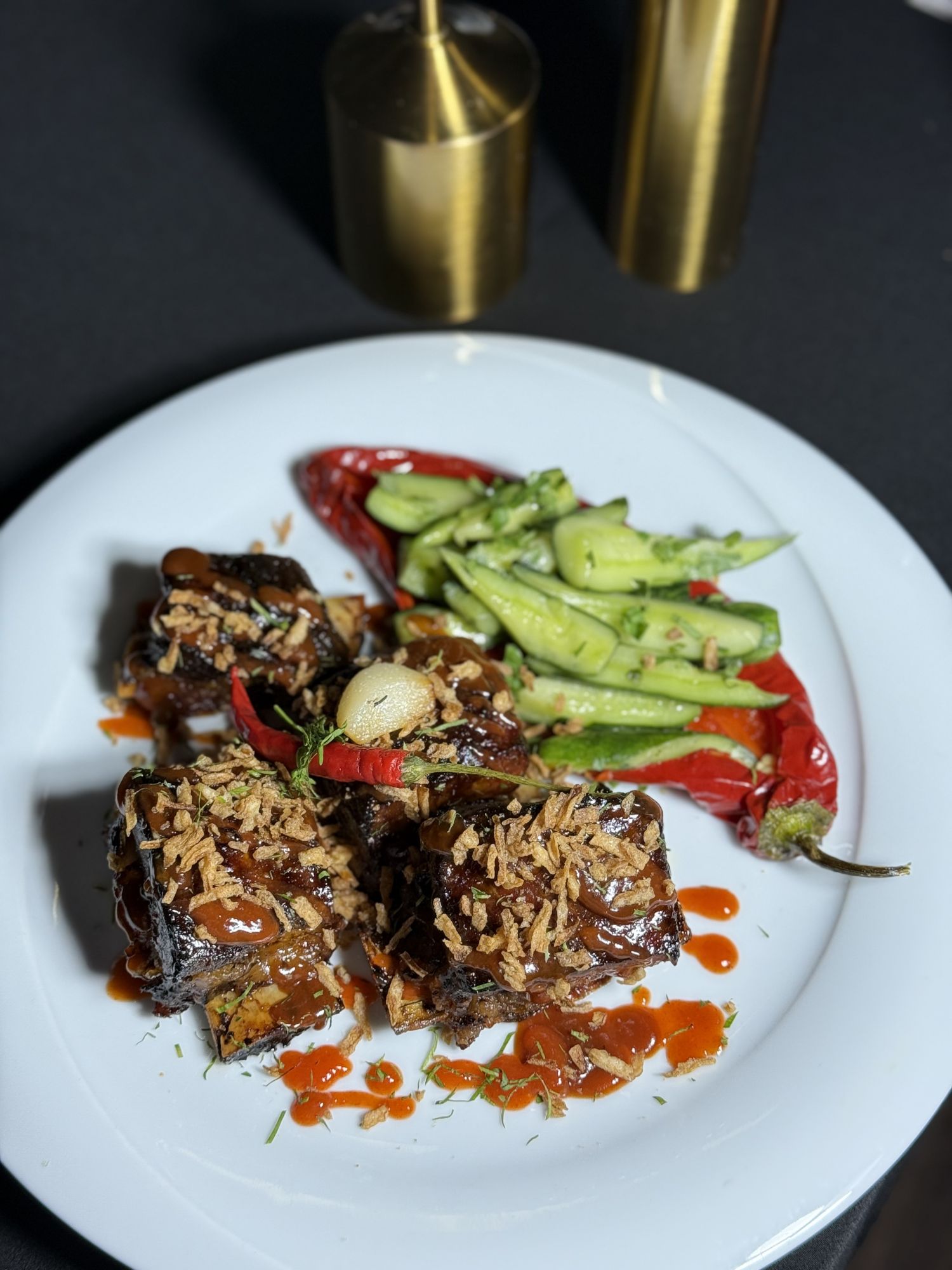 копченые ребра в соусе барбекю, с гарниром из печеного полугорького перца, малосольных огурцов, подаются с соусами барбекю и шрирача